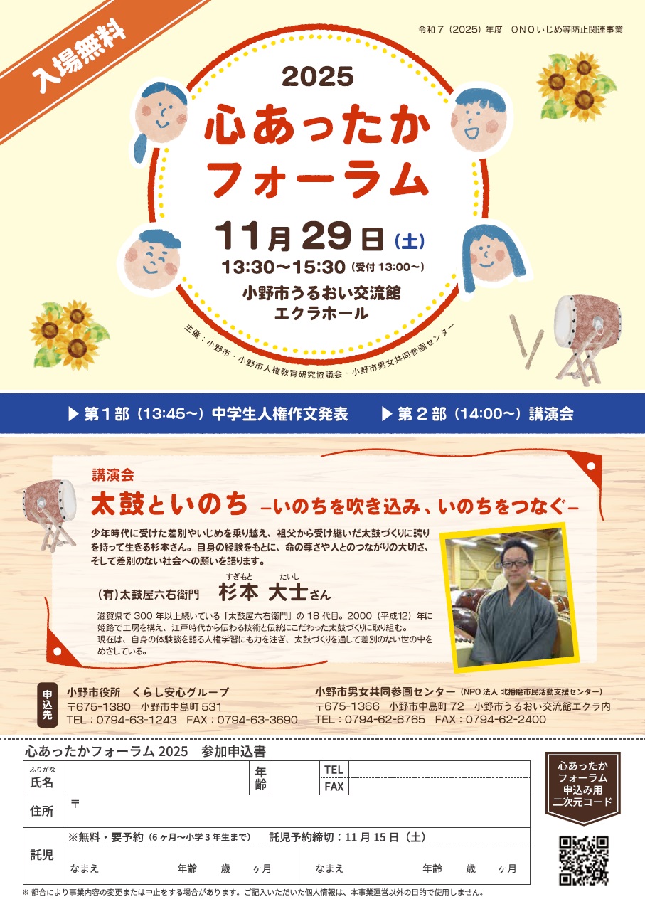 講演会「太鼓といのち〜いのちを吹き込み、いのちをつなぐ〜」 ![]() ●日 時 :11月29日(土)13:30〜15:30(受付13:00〜) ※講演会は14:00〜 【第1部】中学生人権作文発表 【第2部】 講演会 ●会 場 :うるおい交流館エクラ エクラホール ●講 師 :(有)太鼓屋六右衛門 杉本大士さん ●入 場 料:無料 ●託 児:無料(要予約:定員10名・6ヶ月以上小学校3年生まで) ※託児申込は11月15日(土)まで ●申 込 先:小野市役所 くらし安心グループ(TEL:0794-63-1243) 小野市男女共同参画センター(TEL:0794-62-6765) ●チラシ<←クリック>※詳細についてはチラシでご確認ください。 ●お申込みはこちら♪