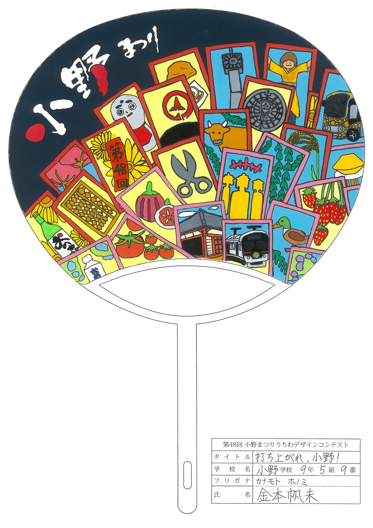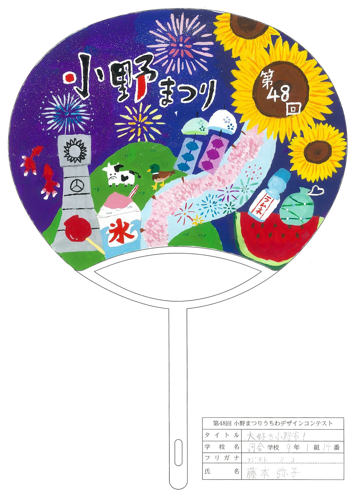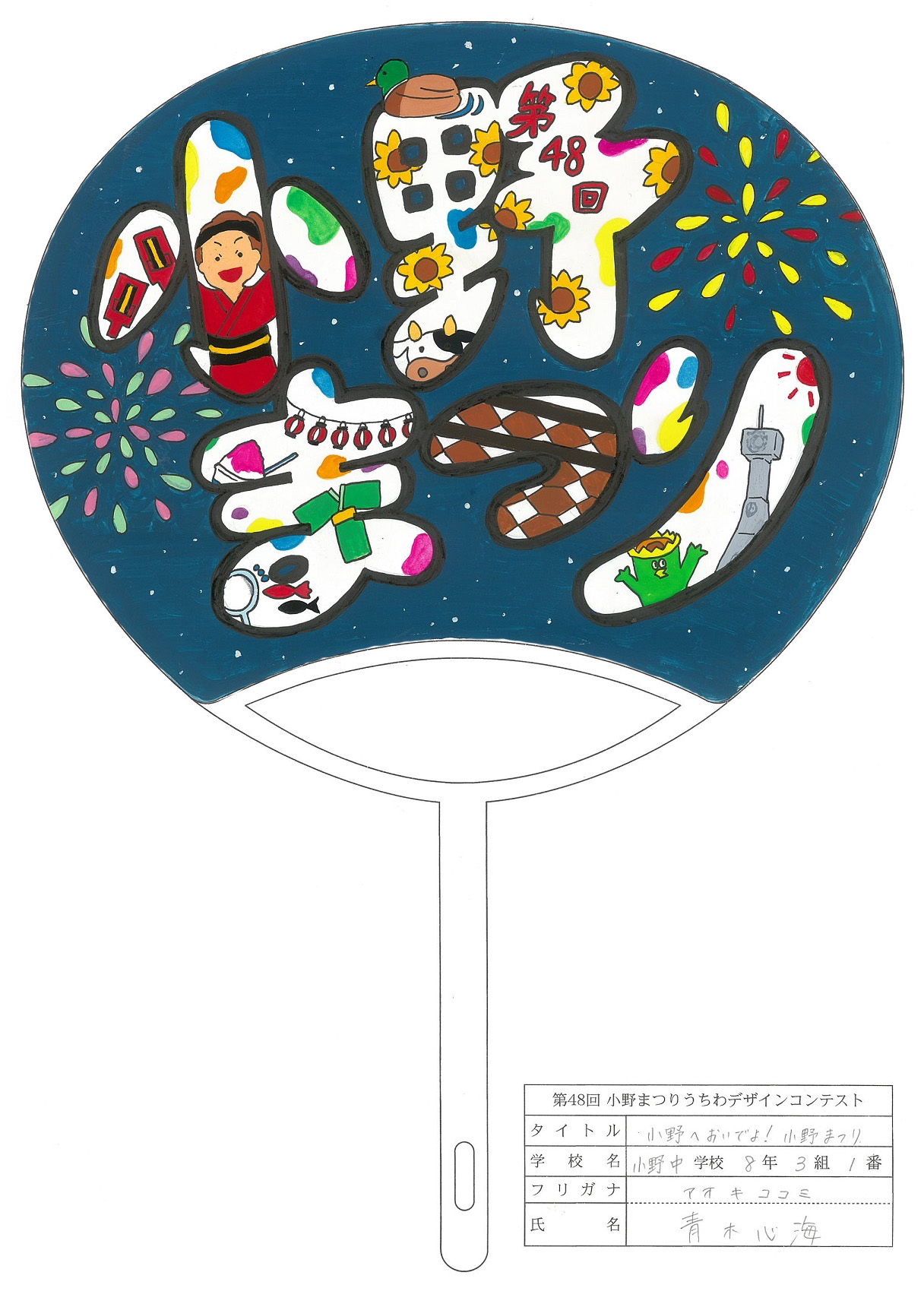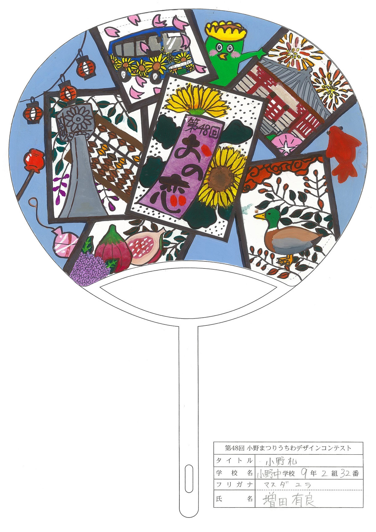 うちわデザイン大賞 河合中学校(9年) 藤本弥子さん 「大好き小野市!」 <審査評> 複数の絵がバランス良く描かれ、小野市の良い所と夏の楽しさが小さな画面の中に上手くまとまっている。 山や桜の風景を取り入れる発想が面白く、それらによって全体に動きが生み出され、構図が秀逸である。 見て楽しい、夏が待ち遠しくなる作品である。 |