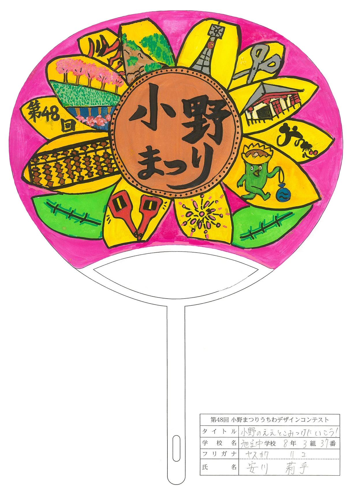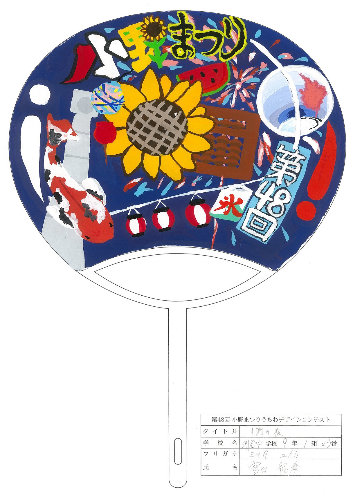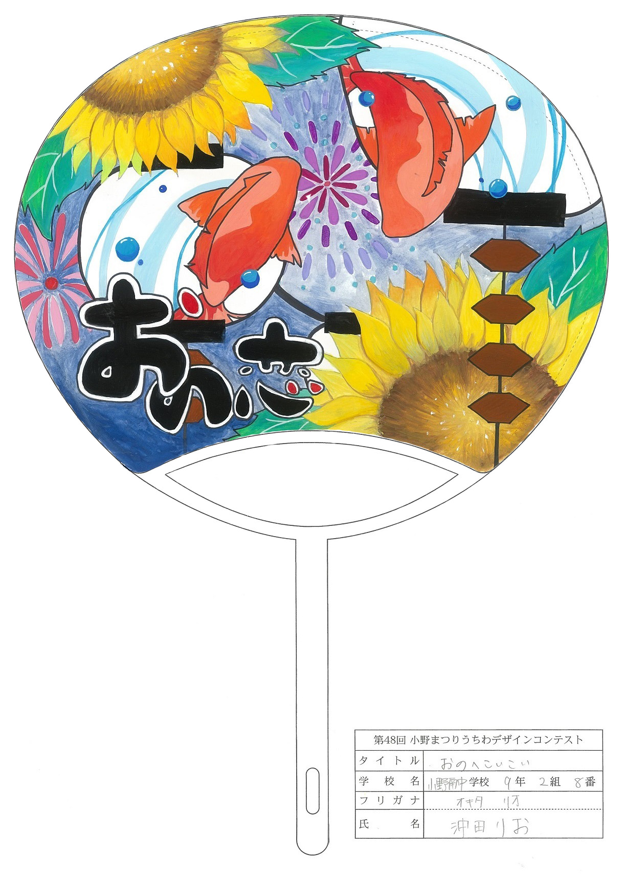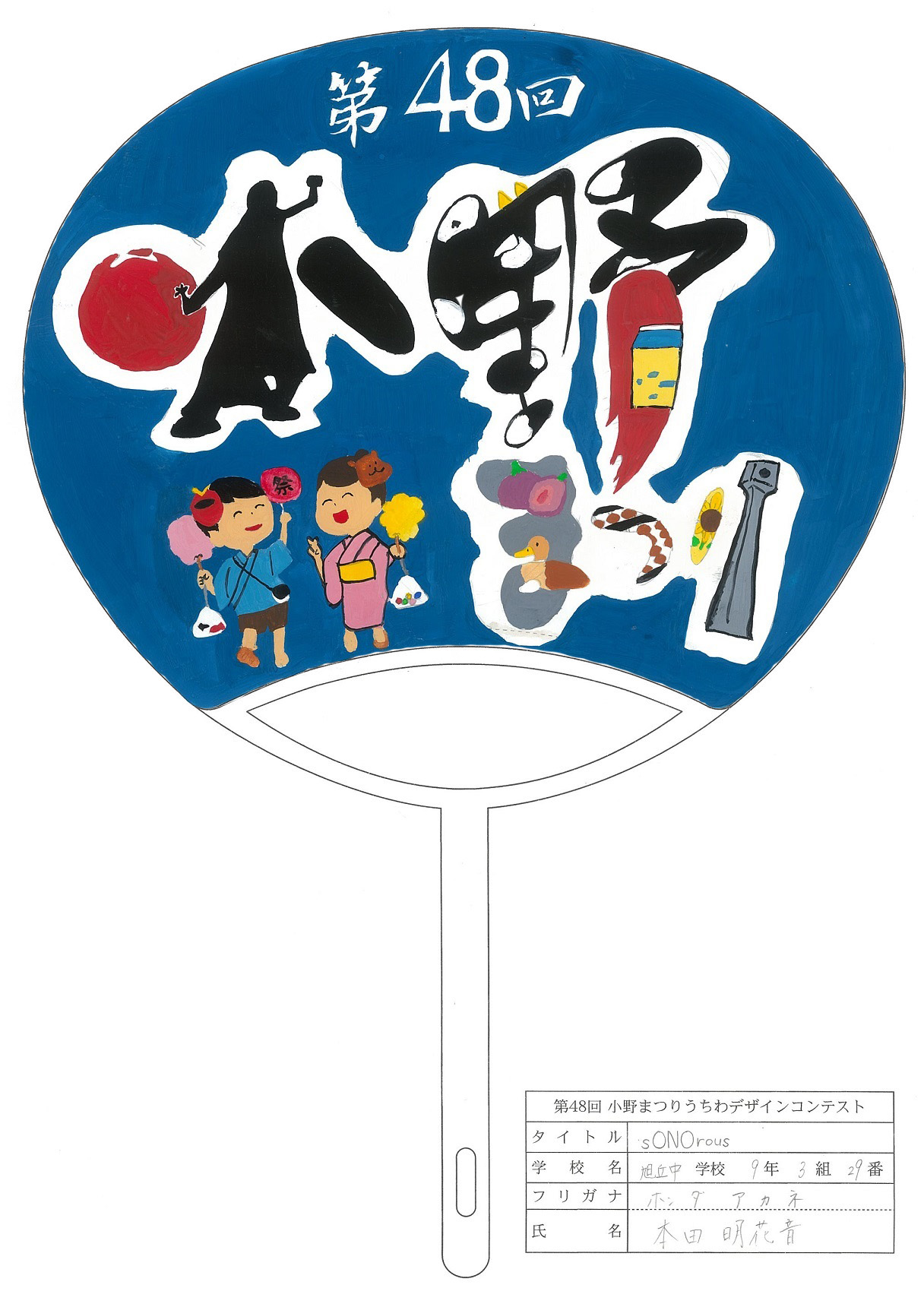 うちわデザイン大賞 河合中学校(9年) 藤本弥子さん 「大好き小野市!」 <審査評> 複数の絵がバランス良く描かれ、小野市の良い所と夏の楽しさが小さな画面の中に上手くまとまっている。 山や桜の風景を取り入れる発想が面白く、それらによって全体に動きが生み出され、構図が秀逸である。 見て楽しい、夏が待ち遠しくなる作品である。 |
