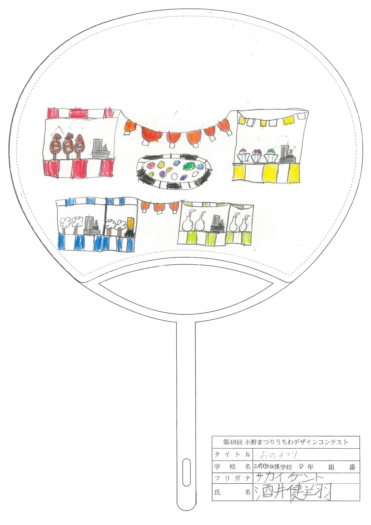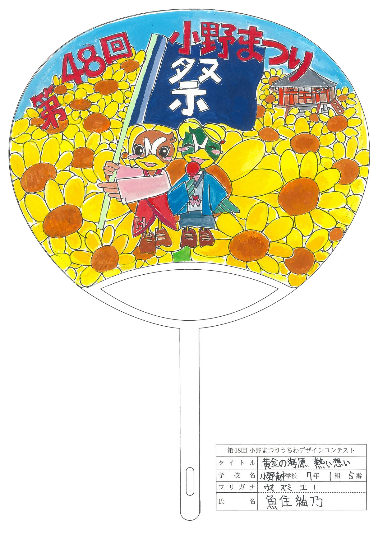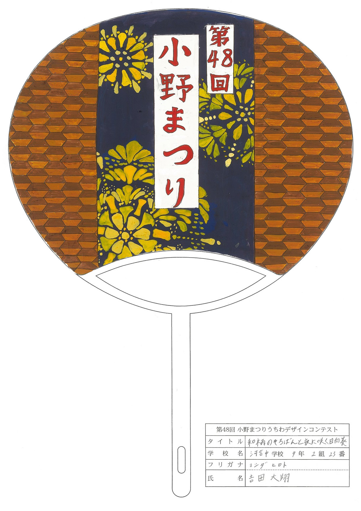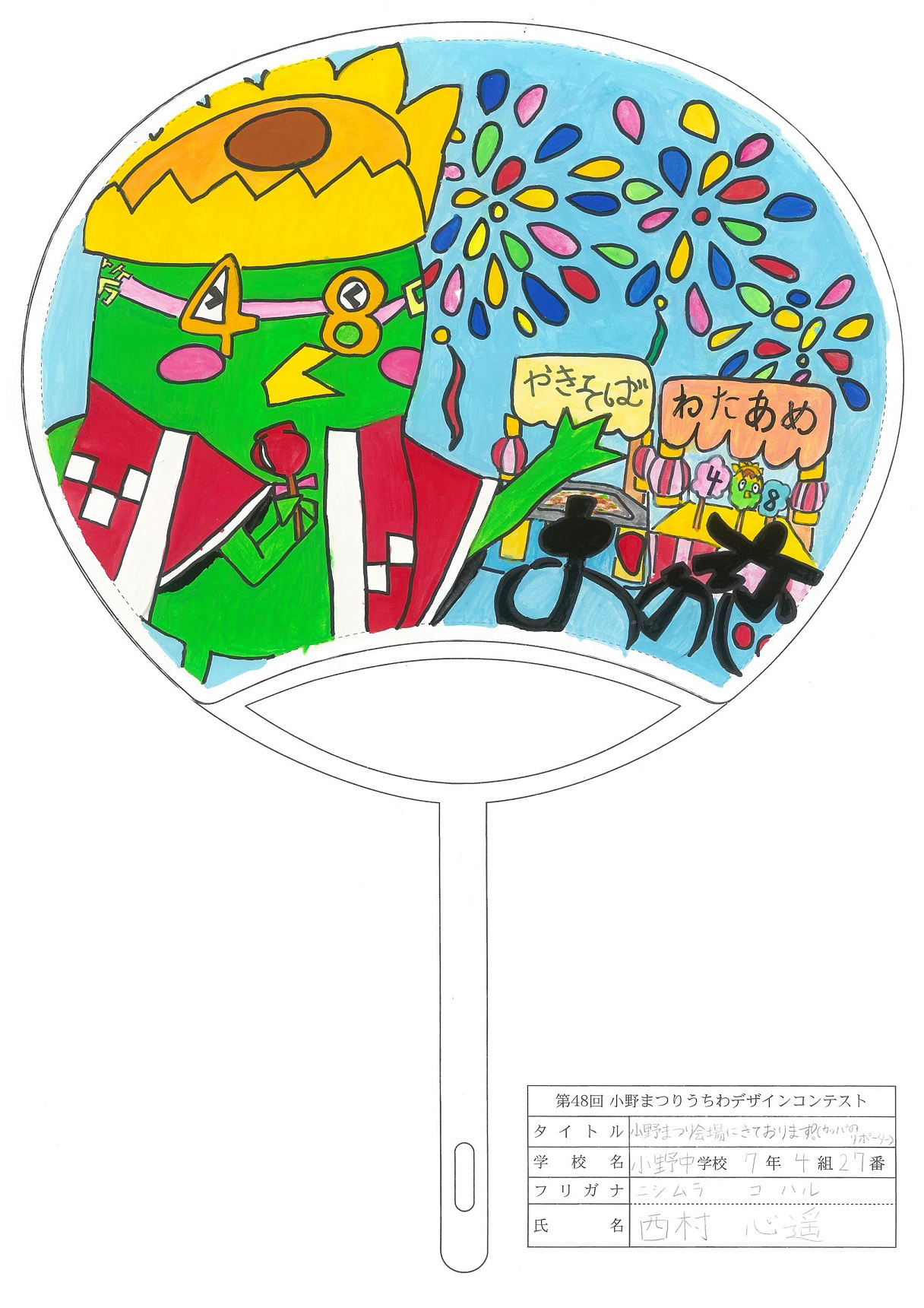 うちわデザイン大賞 河合中学校(9年) 藤本弥子さん 「大好き小野市!」 <審査評> 複数の絵がバランス良く描かれ、小野市の良い所と夏の楽しさが小さな画面の中に上手くまとまっている。 山や桜の風景を取り入れる発想が面白く、それらによって全体に動きが生み出され、構図が秀逸である。 見て楽しい、夏が待ち遠しくなる作品である。 |