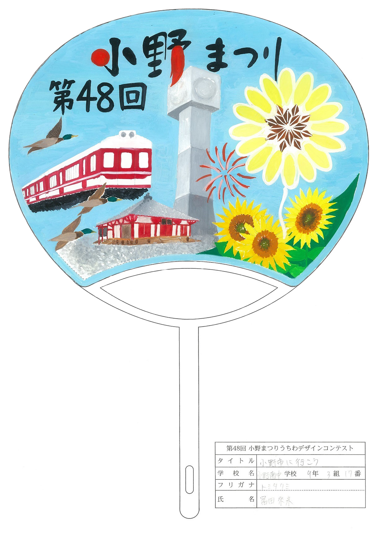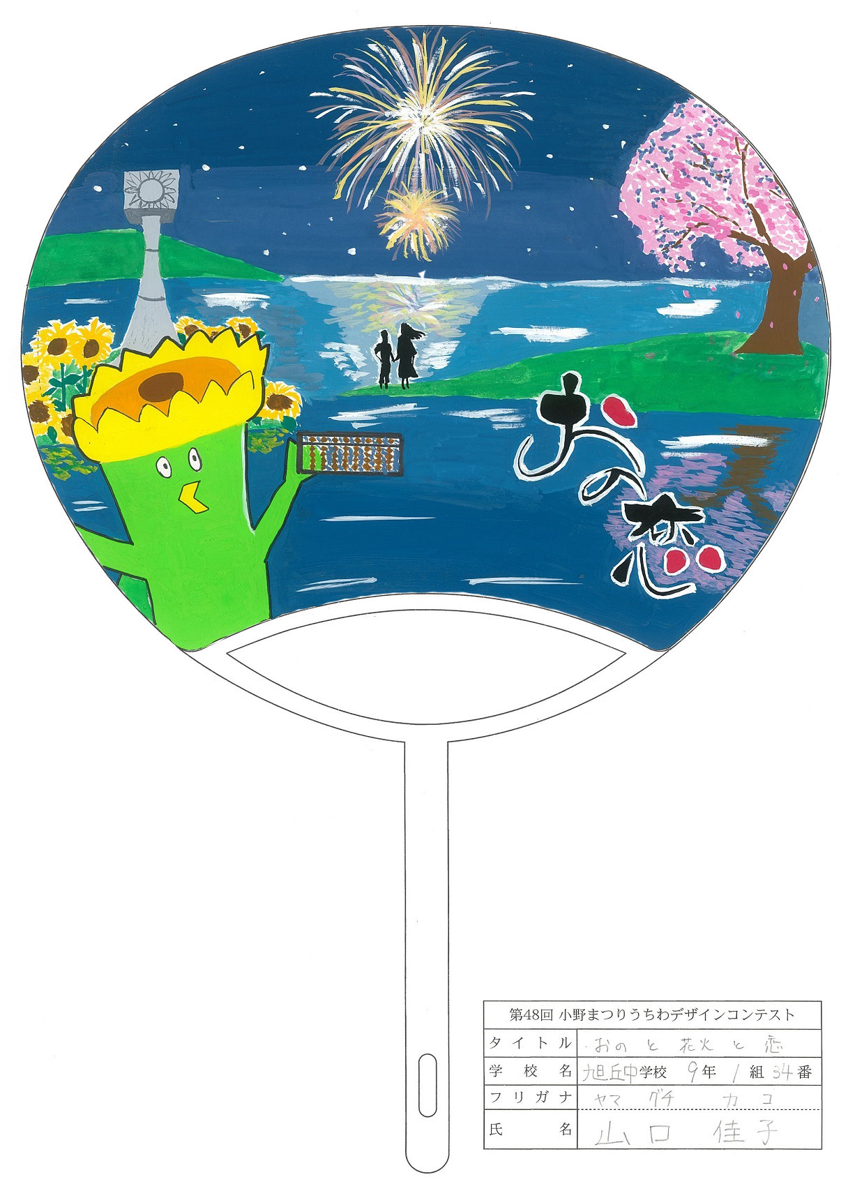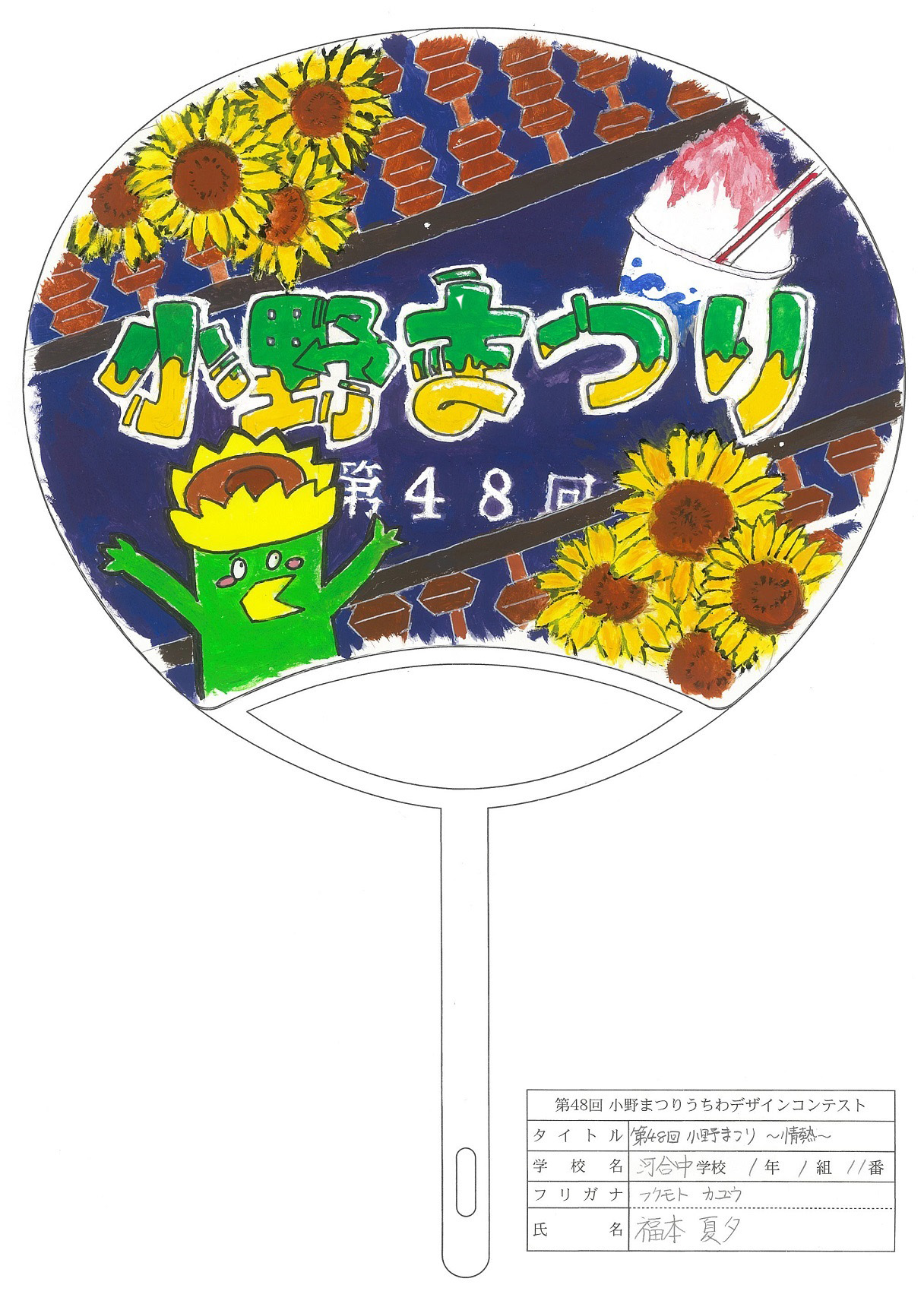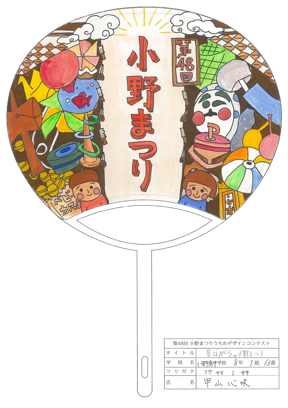 うちわデザイン大賞 河合中学校(9年) 藤本弥子さん 「大好き小野市!」 <審査評> 複数の絵がバランス良く描かれ、小野市の良い所と夏の楽しさが小さな画面の中に上手くまとまっている。 山や桜の風景を取り入れる発想が面白く、それらによって全体に動きが生み出され、構図が秀逸である。 見て楽しい、夏が待ち遠しくなる作品である。 |