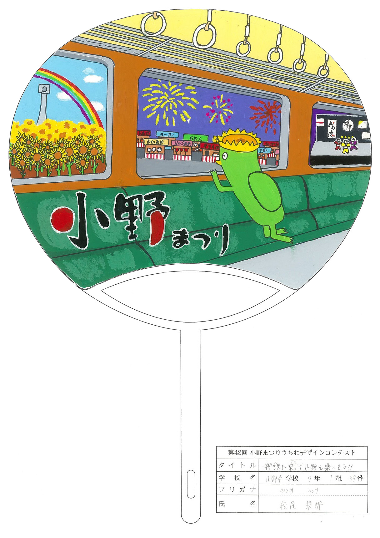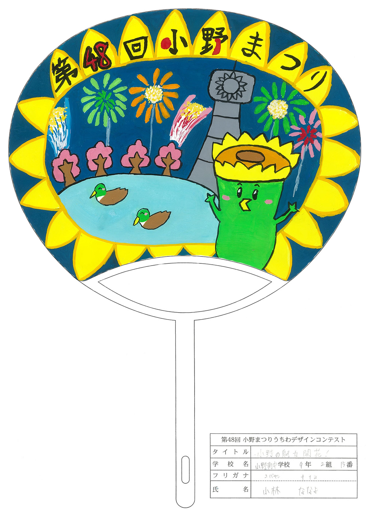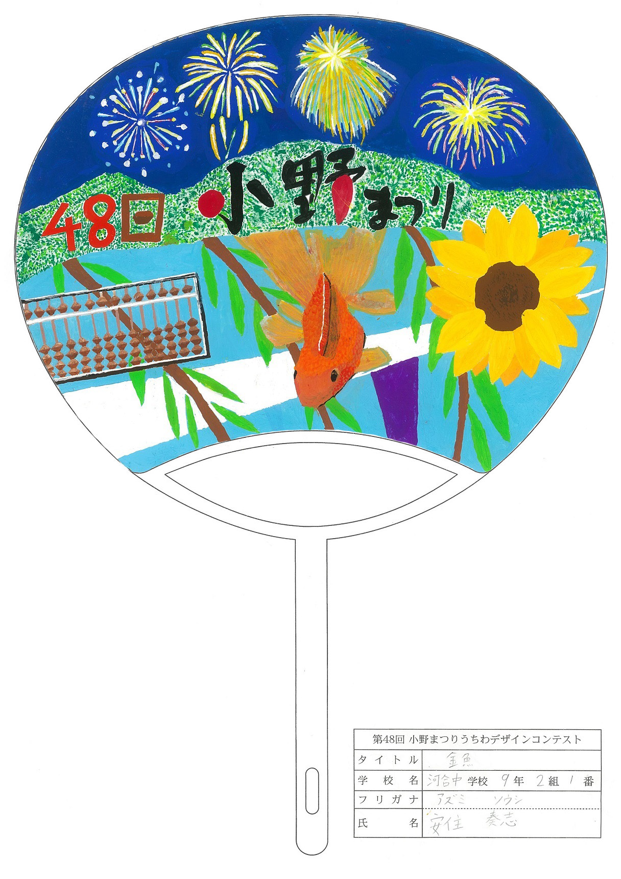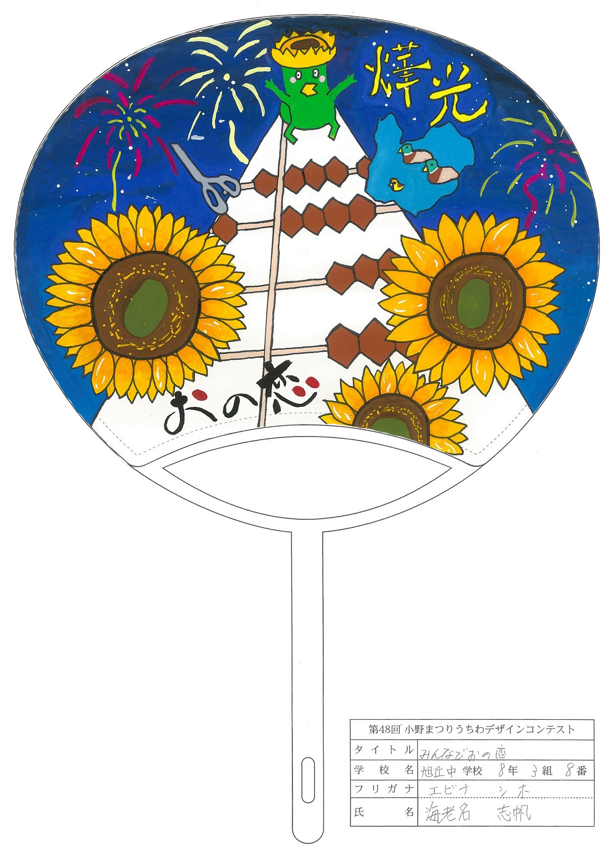 うちわデザイン大賞 河合中学校(9年) 藤本弥子さん 「大好き小野市!」 <審査評> 複数の絵がバランス良く描かれ、小野市の良い所と夏の楽しさが小さな画面の中に上手くまとまっている。 山や桜の風景を取り入れる発想が面白く、それらによって全体に動きが生み出され、構図が秀逸である。 見て楽しい、夏が待ち遠しくなる作品である。 |