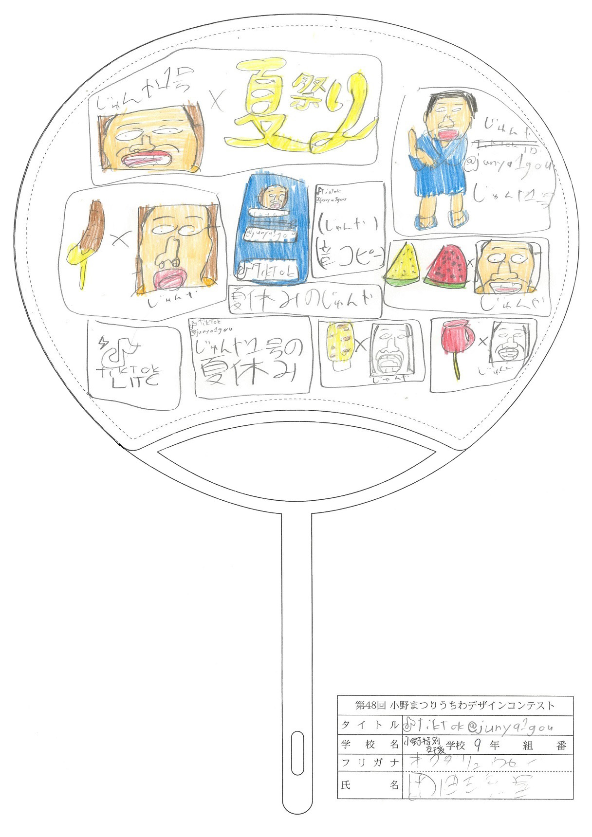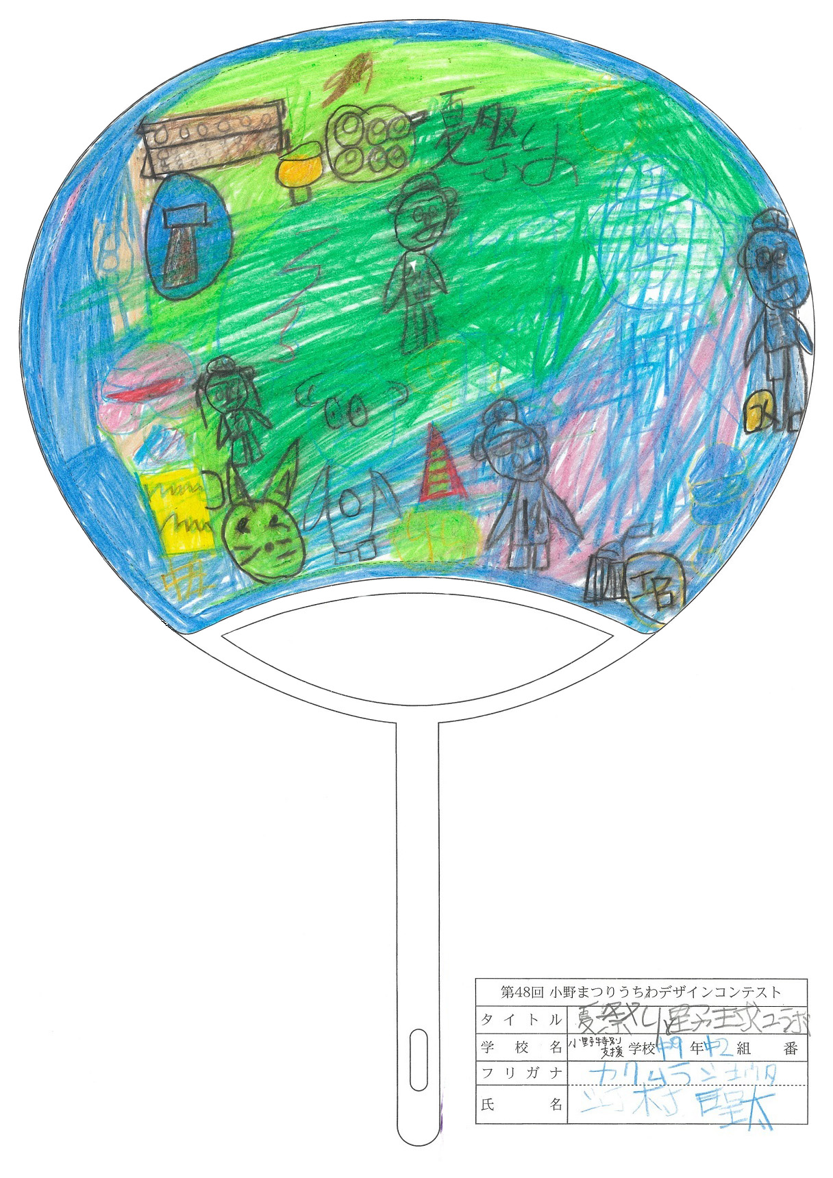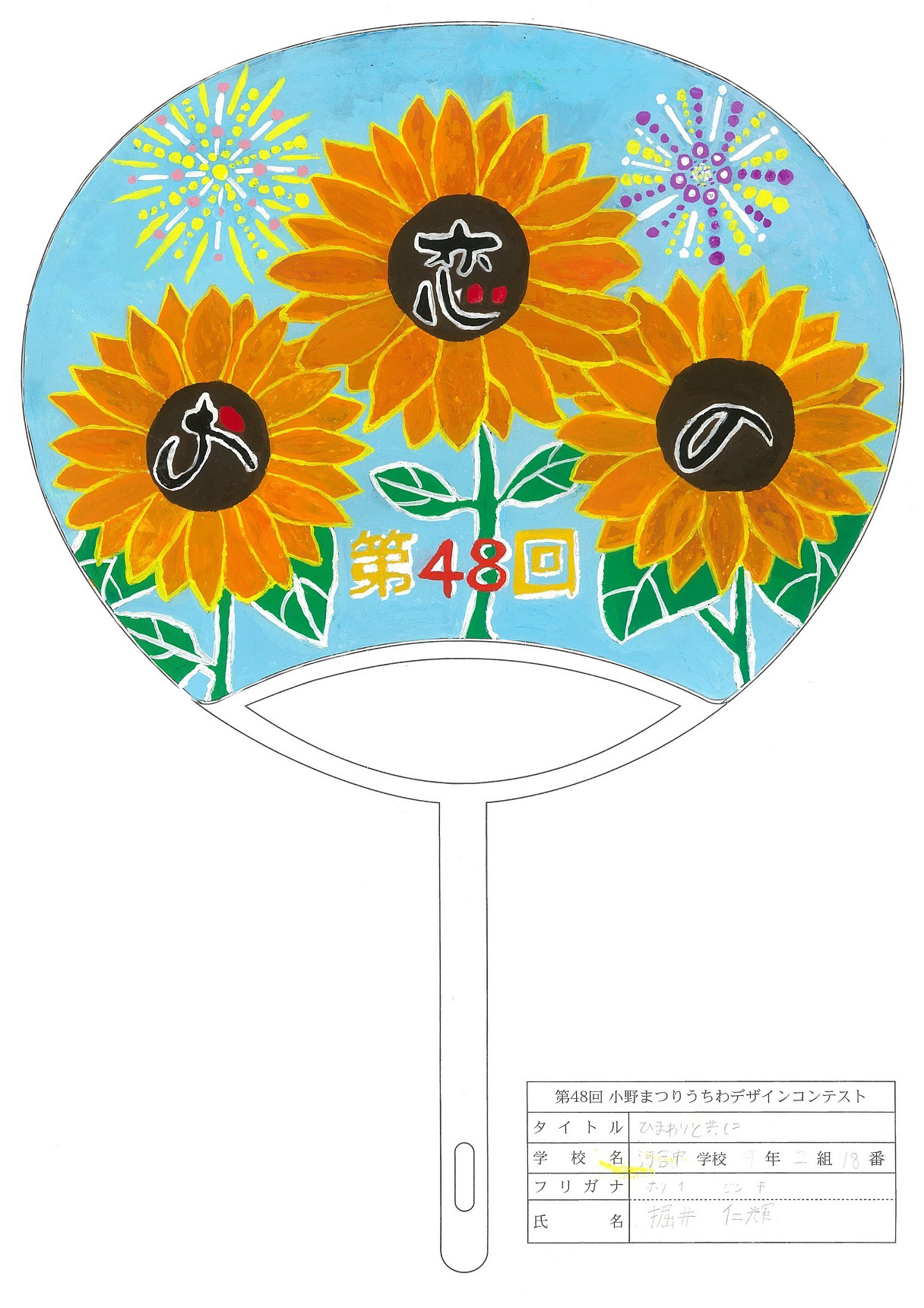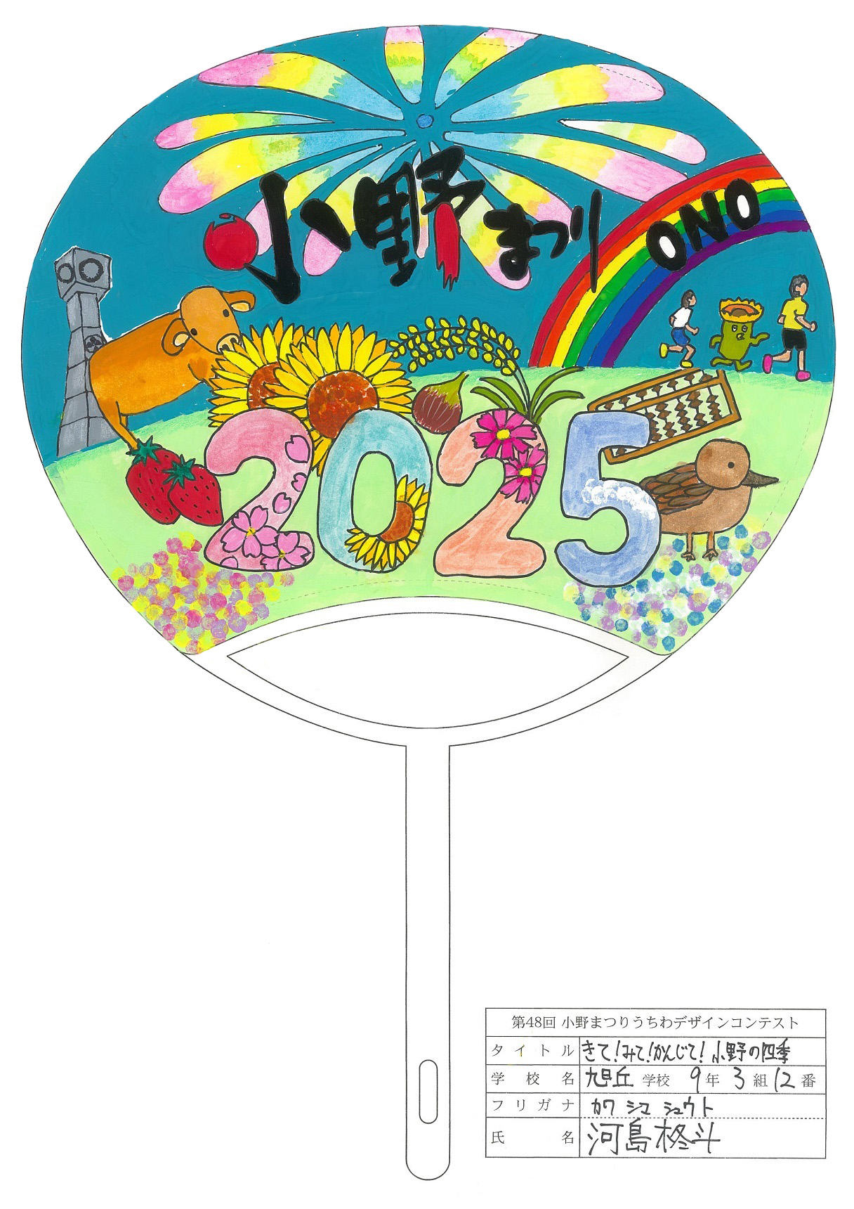 うちわデザイン大賞 河合中学校(9年) 藤本弥子さん 「大好き小野市!」 <審査評> 複数の絵がバランス良く描かれ、小野市の良い所と夏の楽しさが小さな画面の中に上手くまとまっている。 山や桜の風景を取り入れる発想が面白く、それらによって全体に動きが生み出され、構図が秀逸である。 見て楽しい、夏が待ち遠しくなる作品である。 |